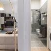 -🛋️ AREA SOGGIORNO: divano, TV, dettagli decorativi, scrivania con sedia, lampada da terra, aria condizionata, zona pranzo e finestra.